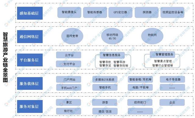 智慧旅游產(chǎn)業(yè)鏈所涉及的環(huán)節(jié)復(fù)雜、行業(yè)眾多,大大超出了傳統(tǒng)旅游行業(yè)的范疇。從結(jié)構(gòu)來看,智慧旅游產(chǎn)業(yè)鏈中既有水平供需關(guān)系,也存在垂直協(xié)作關(guān)系。同時(shí),隨著技術(shù)的不斷提升、需求更新,持續(xù)不斷有新的企業(yè)進(jìn)入產(chǎn)業(yè)鏈。中商產(chǎn)業(yè)研究院整理了我國智慧旅游產(chǎn)業(yè)鏈圖主要包括:感知基礎(chǔ)層、通信網(wǎng)絡(luò)層、平臺服務(wù)層、服務(wù)載體層以及服務(wù)對象層五大層面,如下圖所示:
