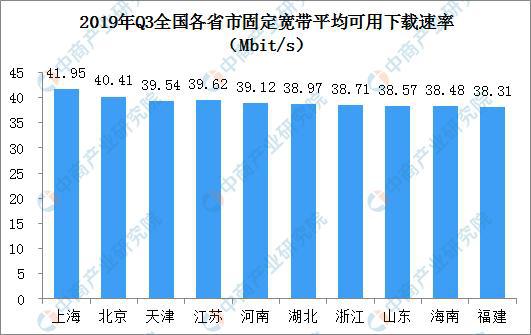 截至2019年第三季度,全國光纖寬帶用戶占比超過91%,寬帶用戶持續(xù)向高速率遷移,100Mbps及以上接入速率的固定互聯(lián)網(wǎng)寬帶接入用戶已占總用戶數(shù)的80.5%;4G用戶占移動電話用戶已達(dá)79.1%,這些指標(biāo)均位居全球前列。固定寬帶下載速率方面,上海、北京、天津位列全國前三位,且上海、北京已率先超過了40Mbit/s,江蘇、河南緊隨其后。全國主要城市排行榜上,上海、北京、南京、鄭州、天津位居前五位。