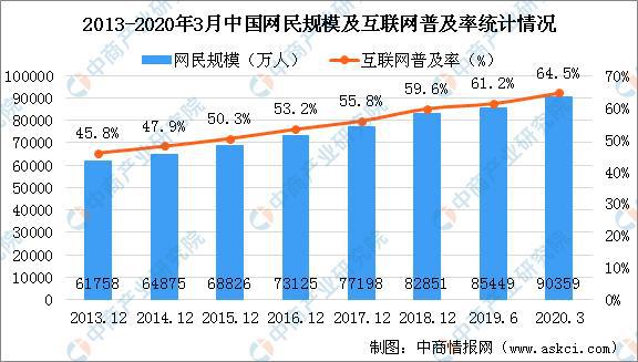 隨著智能手機(jī)的大力推廣和普及,推動著移動互聯(lián)網(wǎng)市場規(guī)模的進(jìn)一步擴(kuò)張,用戶規(guī)模不斷攀升?;ヂ?lián)網(wǎng)行業(yè)持續(xù)穩(wěn)健發(fā)展,互聯(lián)網(wǎng)已成為推動我國經(jīng)濟(jì)社會發(fā)展的重要力量。據(jù)《中國互聯(lián)網(wǎng)絡(luò)發(fā)展?fàn)顩r統(tǒng)計(jì)報(bào)告》數(shù)據(jù)顯示:截至2020年3月28,我國網(wǎng)民規(guī)模為9.04億,較2018年底新增網(wǎng)民7508萬,互聯(lián)網(wǎng)普及率達(dá)64.5%,較2018年底提升4.9個(gè)百分點(diǎn)。