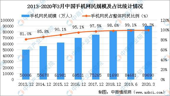 截至2020年3月,我國手機(jī)網(wǎng)民規(guī)模為8.97億,較2018年底新增手機(jī)網(wǎng)民7992萬,網(wǎng)民中使用手機(jī)上網(wǎng)的比例為99.3%,較2018年底提升0.7個(gè)百分點(diǎn)。