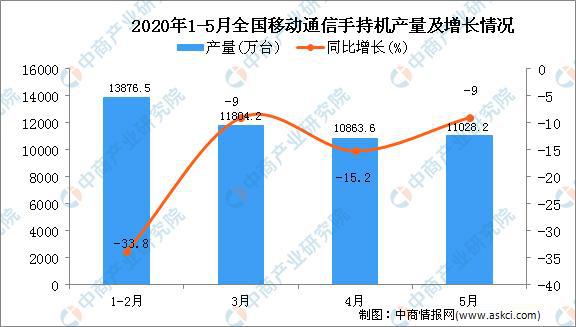據(jù)中商產(chǎn)業(yè)研究院數(shù)據(jù)庫顯示,2020年5月全國移動通信手持機(jī)產(chǎn)量下降,2020年5月全國移動通信手持機(jī)產(chǎn)量為11028.2萬臺,同比下降9%。2020年1-5月全國移動通信手持機(jī)產(chǎn)量為46323.9萬臺,同比下降16.5%。