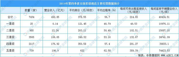 根據(jù)文化和旅游部數(shù)據(jù)顯示,到2019年第四季度,全國星級飯店統(tǒng)計(jì)管理系統(tǒng)中共有星級飯店10130家。共有7434家星級飯店通過省級文化和旅游行政部門審核,其中包括一星級25家,二星級988家,三星級3565家,四星級2117家,五星級739家。