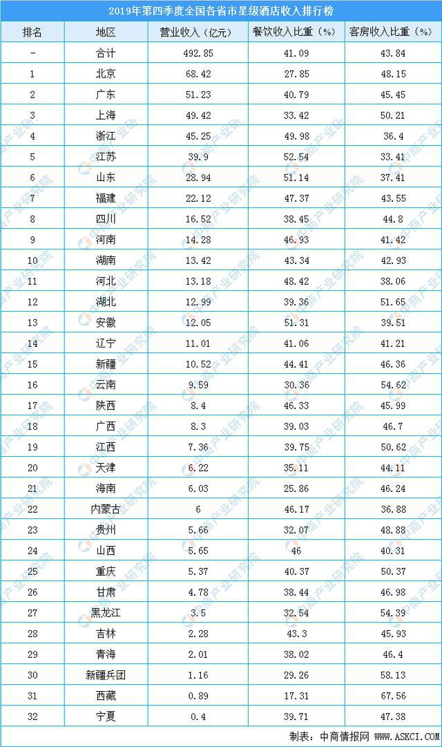 從2019第四季度各地區(qū)星級酒店經(jīng)營情況看,共有2個(gè)地區(qū)營收超50億元,分別是北京68.42億元,其中餐飲收入占比27.85%,客房收入占比48.15%;廣東521.23億元排名第二。上海市195家星級酒店實(shí)現(xiàn)營業(yè)收入49.42億元,排名第三。另外,全國共有15個(gè)地區(qū)營收超10億元。