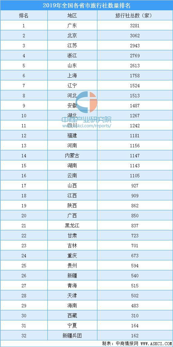 從全國旅行社分布來看,東部地區(qū)和西部地區(qū)旅行社數(shù)量較多,合計(jì)占全國旅行社總量超70%。旅行社數(shù)量在2500家以上的有5個(gè)地區(qū),分別為廣東、北京、江蘇、浙江和山東,數(shù)量最多的廣東為3281家。海南、西藏、寧夏、新疆兵團(tuán)4個(gè)地區(qū)旅行社數(shù)量少于500家,最少的新疆兵團(tuán)為162家。旅行社數(shù)量在500-1000家的有12個(gè)地區(qū),1000-1500家的有8個(gè)地區(qū),1500-2000家的有3個(gè)地區(qū)。2019年全國各省市旅行社數(shù)量排名如下: