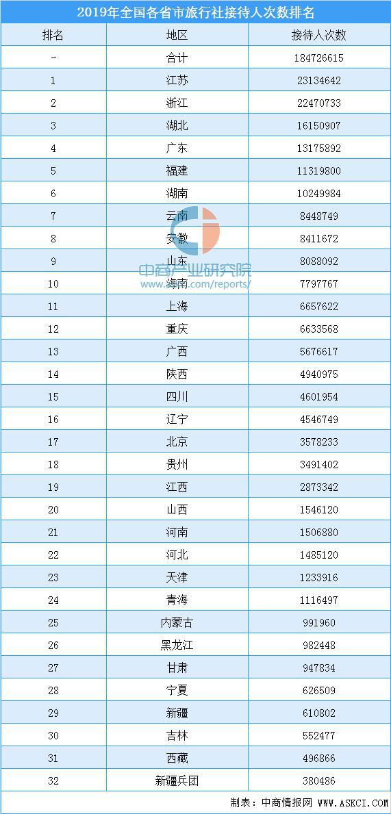 從各省市旅行社接待人次數(shù)來看,2019年全國旅行社共接待人數(shù)18472.66萬人次。從接待人次來看,江蘇省接待游客人數(shù)最多,全年共接待人數(shù)2313.46萬人次,位列全國第一。浙江接待人次2247.07萬人次,排名第二位。湖北以接待人數(shù)1615.09萬人次排名第三位。2019年全國各省市旅行社接待人次數(shù)排名如下: