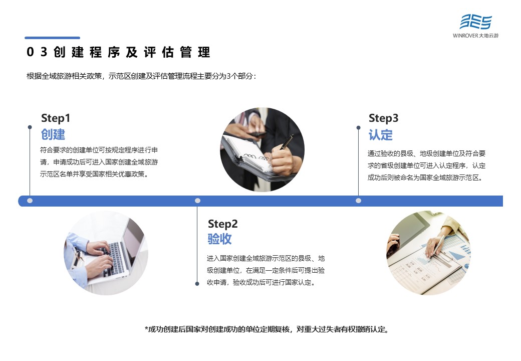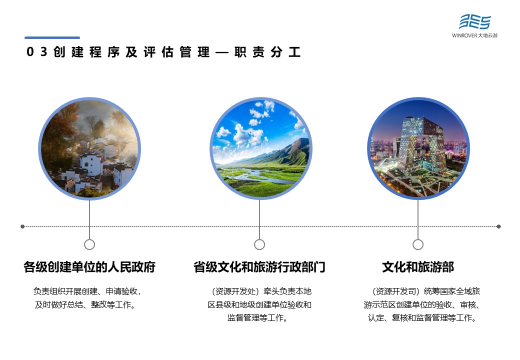 根據(jù)全域旅游相關(guān)政策,示范區(qū)創(chuàng)建及評(píng)估管理流程主要分為3個(gè)部分:即創(chuàng)建——驗(yàn)收——認(rèn)定。各級(jí)創(chuàng)建單位的人民政府,負(fù)責(zé)組織開展創(chuàng)建、申請(qǐng)驗(yàn)收,及時(shí)做好總結(jié)、整改等工作;省級(jí)文化和旅游行政部門牽頭負(fù)責(zé)本地區(qū)縣級(jí)和地級(jí)創(chuàng)建單位驗(yàn)收和監(jiān)督管理等工作;文化和旅游部統(tǒng)籌國(guó)家全域旅游示范區(qū)創(chuàng)建單位的驗(yàn)收、審核、認(rèn)定、復(fù)核和監(jiān)督管理等工作。