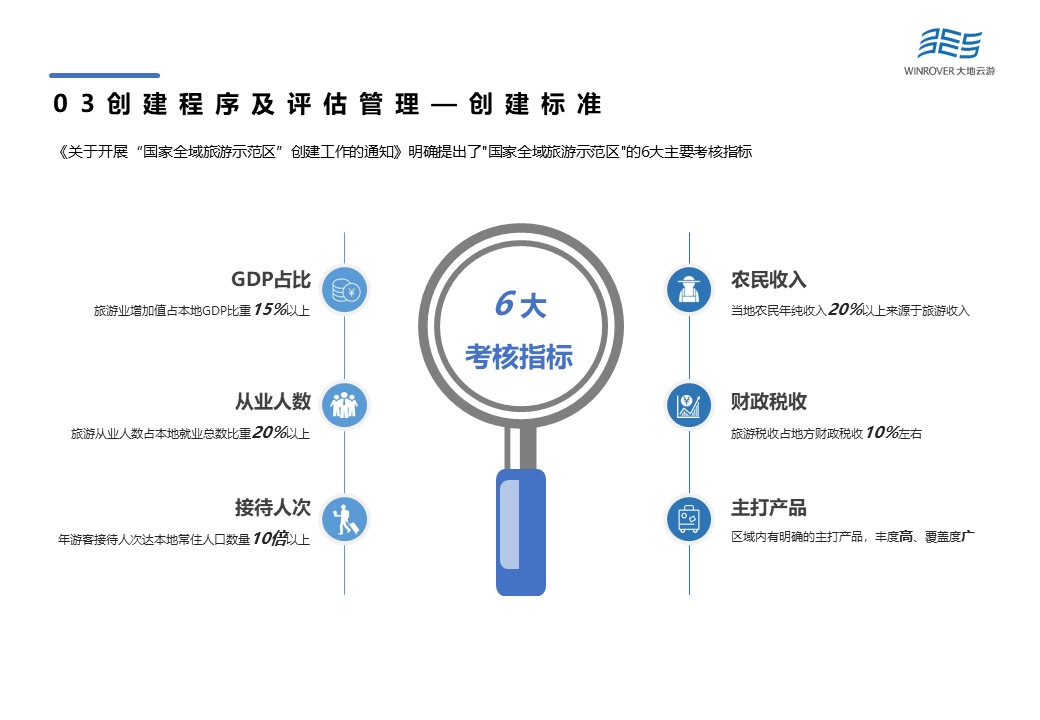 根據(jù)規(guī)定,各地首批申報(bào),原則上不超過10%左右的縣(含縣級(jí)市),有條件省份可適當(dāng)申報(bào)市(地州)為創(chuàng)建對(duì)象。創(chuàng)建主體為縣、市地州人民政府?!蛾P(guān)于開展“國(guó)家全域旅游示范區(qū)”創(chuàng)建工作的通知》明確提出了“國(guó)家全域旅游示范區(qū)”的6大主要考核指標(biāo)包括:GDP占比、從業(yè)人數(shù)、接待人次、農(nóng)民收入、財(cái)政稅收以及主打產(chǎn)品。
