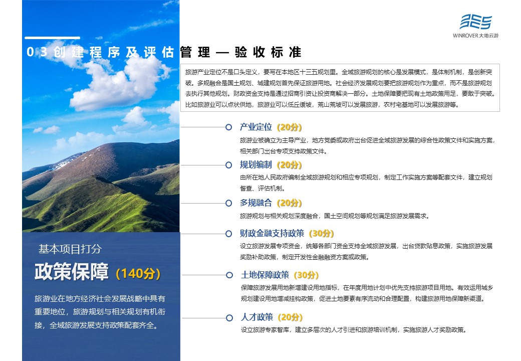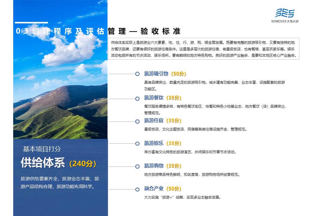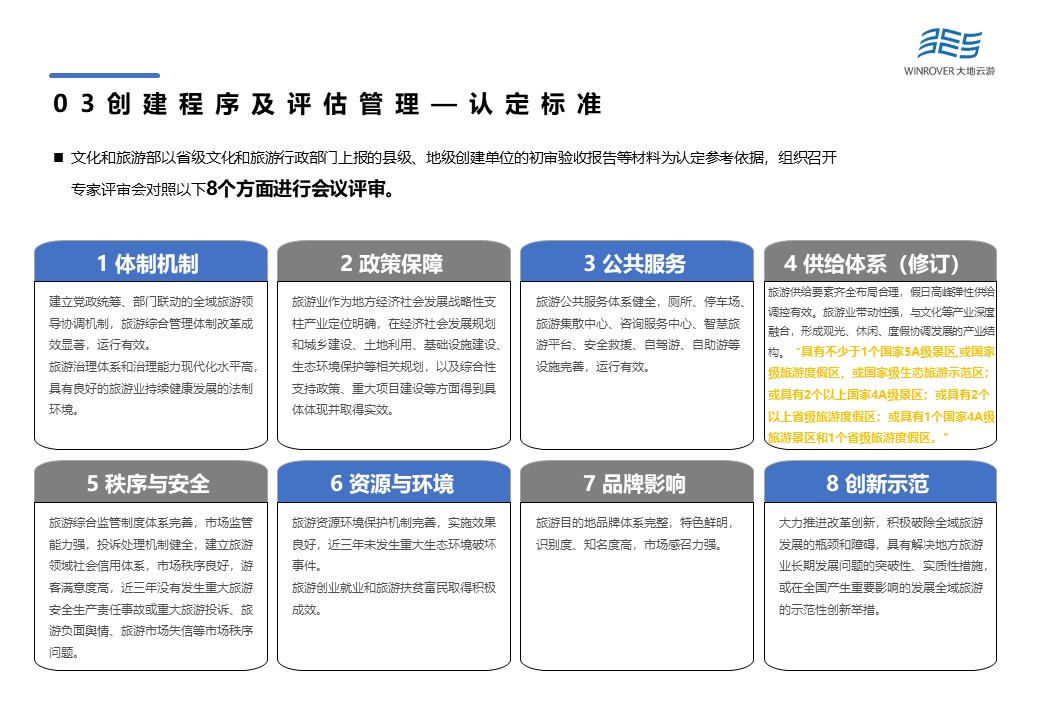 文化和旅游部以省級(jí)文化和旅游行政部門上報(bào)的縣級(jí)、地級(jí)創(chuàng)建單位的初審驗(yàn)收?qǐng)?bào)告等材料為認(rèn)定參考依據(jù),組織召開專家評(píng)審會(huì)對(duì)體制機(jī)制、政策保障、公共服務(wù)、供給體系、秩序與安全、資源與環(huán)境、品牌影響以及創(chuàng)新示范等8個(gè)方面進(jìn)行會(huì)議評(píng)審。根據(jù)最新修訂結(jié)果,認(rèn)定標(biāo)準(zhǔn)在供給體系方面進(jìn)行了適當(dāng)“放寬”,將“具有不少于1個(gè)國(guó)家5A級(jí)旅游景區(qū),或國(guó)家級(jí)旅游度假區(qū),或國(guó)家級(jí)生態(tài)旅游示范區(qū);或具有2個(gè)以上國(guó)家4A級(jí)旅游景區(qū)”修改為“具有不少于1個(gè)國(guó)家5A級(jí)景區(qū),或國(guó)家級(jí)旅游度假區(qū),或國(guó)家級(jí)生態(tài)旅游示范區(qū);或具有2個(gè)以上國(guó)家4A級(jí)景區(qū);或具有2個(gè)以上省級(jí)旅游度假區(qū);或具有1個(gè)國(guó)家4A級(jí)旅游景區(qū)和1個(gè)省級(jí)旅游度假區(qū)?!?/p>
