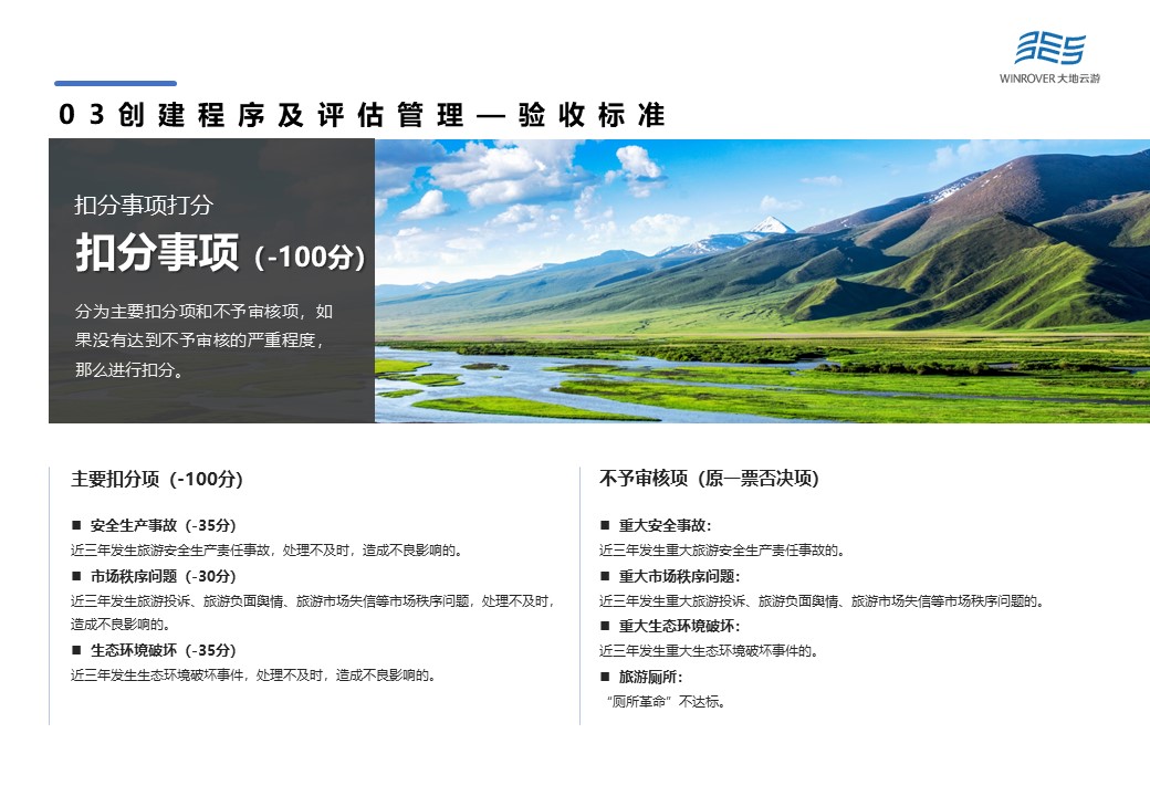 驗(yàn)收標(biāo)準(zhǔn)打分包含基本項(xiàng)目1000分,創(chuàng)新示范項(xiàng)目200分,以及扣分事項(xiàng)100分。其中,基本項(xiàng)目與扣分事項(xiàng)是國(guó)家全域旅游示范區(qū)驗(yàn)收工作基礎(chǔ)。一個(gè)是適應(yīng)旅游者需求的變化,一個(gè)是適應(yīng)旅游者需求的體制機(jī)制的變化。而創(chuàng)新示范項(xiàng)目是國(guó)家全域旅游示范區(qū)驗(yàn)收工作核心,是對(duì)改革創(chuàng)新的打分?;卷?xiàng)目與扣分事項(xiàng)能夠得900分已屬優(yōu)秀,改革創(chuàng)新如果沒有拿到100分以上,就不可能是全域旅游示范區(qū)。