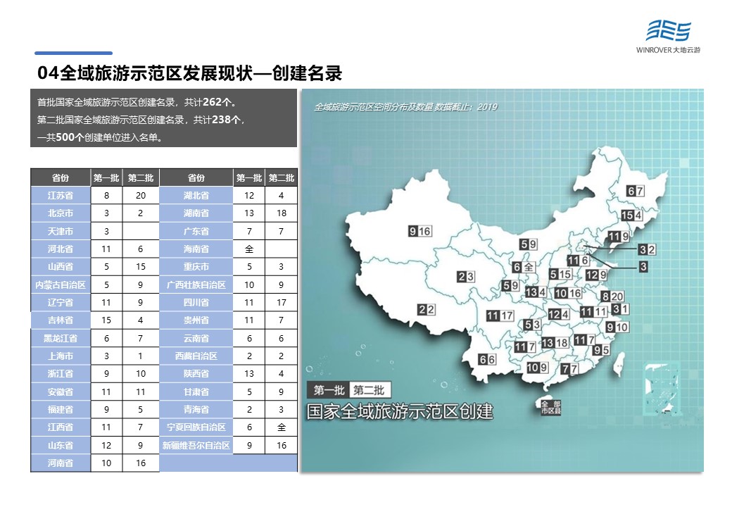 2016年2月,國(guó)家旅游局公布了首批國(guó)家全域旅游示范區(qū)創(chuàng)建名錄,共計(jì)262個(gè);11月,國(guó)家旅游局公布了第二批國(guó)家全域旅游示范區(qū)創(chuàng)建名錄,共計(jì)238個(gè)。其中,海南省被確定為首個(gè)全域旅游創(chuàng)建省。