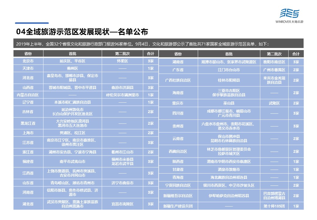 2019年上半年,全國(guó)32個(gè)省級(jí)文化和旅游行政部門報(bào)送96家單位。9月4日,文化和旅游部公示了首批共71家國(guó)家全域旅游示范區(qū)名單,大陸32個(gè)省市自治區(qū)均有1-3家全域旅游示范區(qū)。