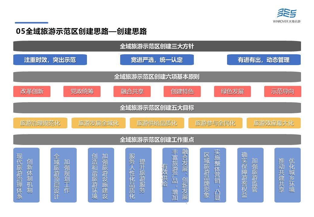 全域旅游的重點(diǎn)創(chuàng)建工作主要體現(xiàn)在創(chuàng)新體制機(jī)制、加強(qiáng)規(guī)劃工作、加強(qiáng)旅游設(shè)施建設(shè)、提升旅游服務(wù)、豐富旅游產(chǎn)品、豐富整體營(yíng)銷、加強(qiáng)旅游監(jiān)管與優(yōu)化城鄉(xiāng)環(huán)境。