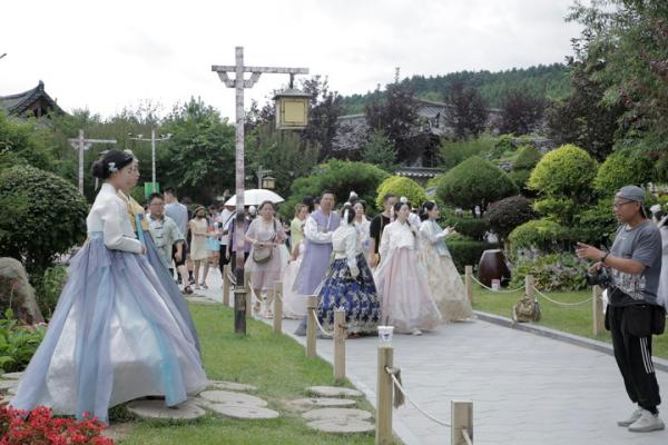 走進(jìn)延吉中國朝鮮族民俗園,隨處可見身著朝鮮族服飾的游客,穿梭于青瓦白墻的院落里,抬眸揮手間皆是風(fēng)景。在民俗園里當(dāng)一天“公主”,在延吉網(wǎng)紅彈幕墻前,手持一杯印有“延吉”字樣的咖啡拍一張照片已經(jīng)成為一種時(shí)尚。