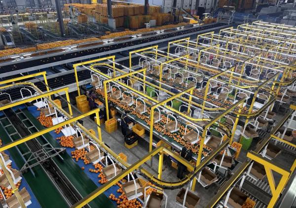 智能分選設備和成箱柑橘占據(jù)了廠房大部分空間,一列列橘色“小球”在數(shù)百米傳送帶上有序滾動、跳躍,最終被分流至精包線,由工人進行核檢包裝。這里是湖南省規(guī)模最大的果品智能化加工基地,每月可加工處理橘橙約1.2萬噸。