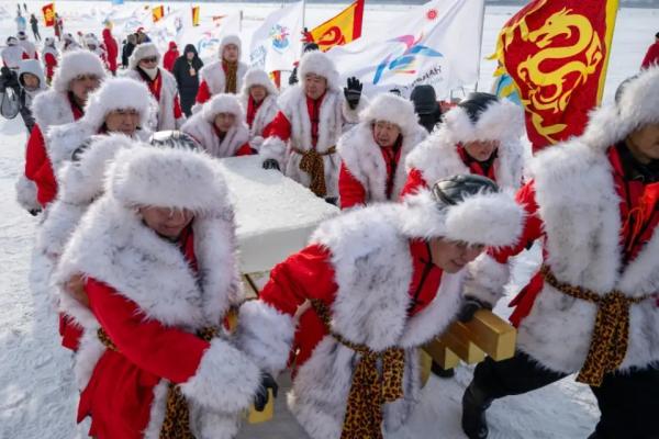 人們簇?fù)碇鴮⒉上碌牡谝粔K頭冰用紅布包裹著送到舞臺中央,祈福詞、出征酒、采頭冰、系鴻運(yùn)……一系列獨(dú)特的民俗儀式讓現(xiàn)場的市民、游客興奮不已?;馃岬牟杀顒?dòng)不僅“燃動(dòng)”松花江面,也成為游客享受冰上運(yùn)動(dòng)與特色美食的熱門“打卡地”。江水煮餃子、江水燉江魚、美味凍貨冰雪宴讓中外游客樂在其中。結(jié)合了冰雪特色的文旅體驗(yàn)活動(dòng)和文創(chuàng)產(chǎn)品也為采冰節(jié)增添了時(shí)尚元素。