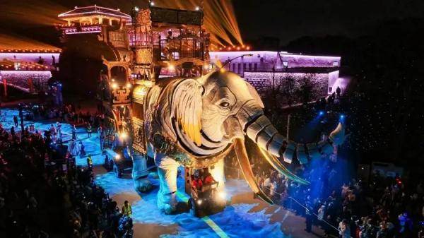 作為核心IP的大型仿生機(jī)械裝置吉象“壯壯”,在首次正式亮相中進(jìn)行多媒體技術(shù)與工業(yè)美學(xué)相結(jié)合的夜秀表演,與光影共同演繹了一場(chǎng)宏偉壯觀的視聽(tīng)盛宴,讓在場(chǎng)的嘉賓、游客感受到了神象現(xiàn)世的震撼與奇幻。