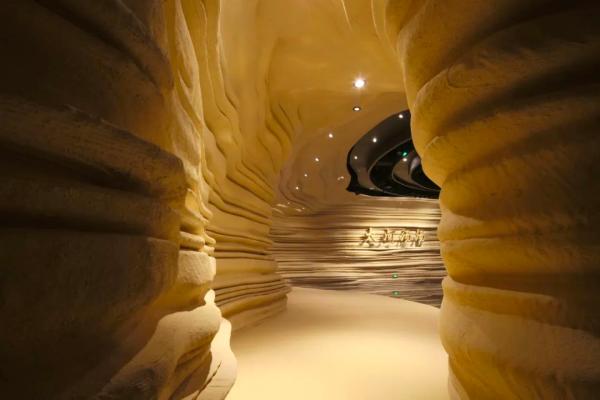 建筑外墻同樣蘊含深意:夯土材質(zhì)模擬黃河泥沙沉積效果,分層勾勒的線條復刻仰韶時期原始肌理,內(nèi)嵌貝殼碎片則傳遞著先民生活的原始脈動。入口處的黃河文化主題墻,更以九種地貌色調(diào)再現(xiàn)黃河“九曲回環(huán)”之勢。
