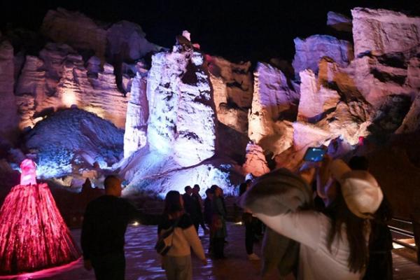 在萬象土林谷,夜幕降臨后,天地之彩、神秘山谷、部族史詩、七彩賜福四個篇章的實景演繹,讓游客在奇幻光影中體驗裕固族神話的魅力。這一創(chuàng)新項目實現(xiàn)了景區(qū)與地域文化的完美結(jié)合,展示了張掖地域文化、景區(qū)地質(zhì)文化和肅南民族文化。