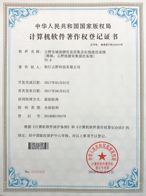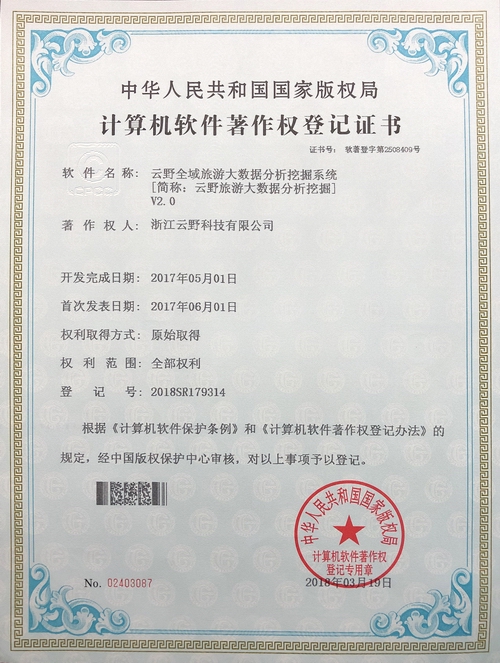 《云野智慧旅游云數(shù)據(jù)中心系統(tǒng)V2.0》于2018年3月14日被正式授予《中華人民共和國(guó)國(guó)家版權(quán)局計(jì)算機(jī)軟件著作權(quán)登記證書(shū)》,登記號(hào)為2018SR167714。