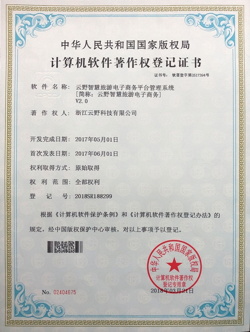 《云野智慧旅游電子商務(wù)平臺(tái)管理系統(tǒng)V2.0》于2018年3月21日被正式授予《中華人民共和國(guó)國(guó)家版權(quán)局計(jì)算機(jī)軟件著作權(quán)登記證書(shū)》,登記號(hào)為2018SR188299。