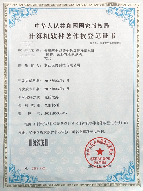 《云野基于VR的全景虛擬漫游系統(tǒng)V2.0》于2019年4月19日被正式授予《中華人民共和國(guó)國(guó)家版權(quán)局計(jì)算機(jī)軟件著作權(quán)登記證書(shū)》,登記號(hào)為2019SR355672。