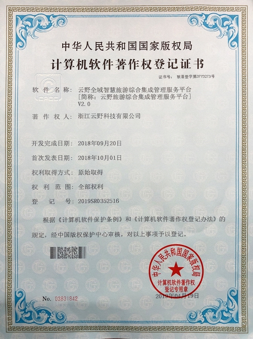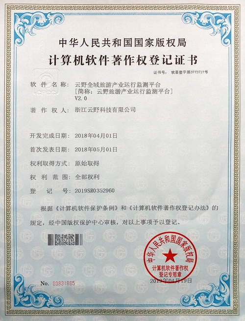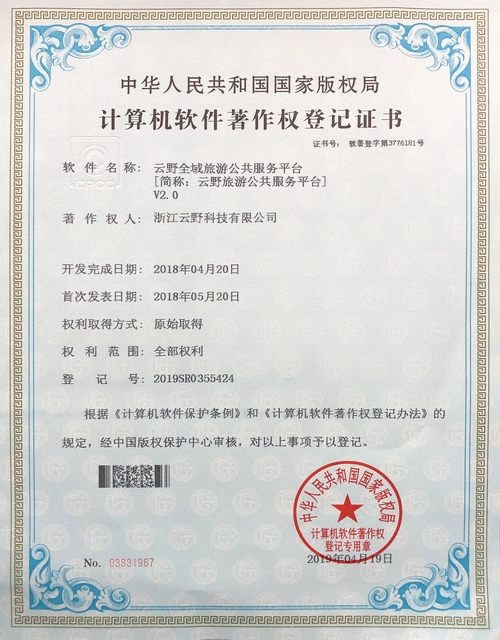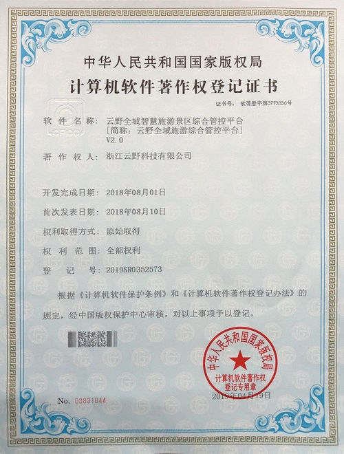 《云野全域智慧旅游景區(qū)綜合管控平臺(tái)V2.0》于2019年4月19日被正式授予《中華人民共和國(guó)國(guó)家版權(quán)局計(jì)算機(jī)軟件著作權(quán)登記證書(shū)》,登記號(hào)為2019SR0352573。