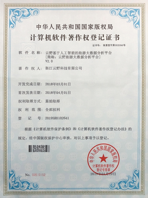 《云野基于人工智能的旅游大數(shù)據(jù)分析平臺(tái)V2.0》于2019年1月29日被正式授予《中華人民共和國(guó)國(guó)家版權(quán)局計(jì)算機(jī)軟件著作權(quán)登記證書(shū)》,登記號(hào)為2019SR0102641。