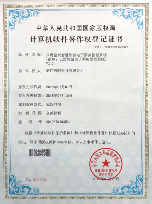 《云野全域智慧旅游電子票務(wù)管理系統(tǒng)V2.0》于2019年1月29日被正式授予《中華人民共和國(guó)國(guó)家版權(quán)局計(jì)算機(jī)軟件著作權(quán)登記證書(shū)》,登記號(hào)為2019SR0103534。