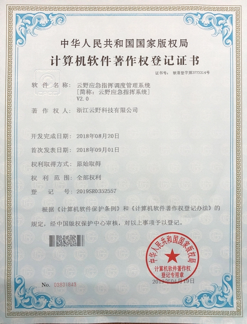 《云野應(yīng)急指揮調(diào)度管理系統(tǒng)V2.0》于2019年4月19日被正式授予《中華人民共和國(guó)國(guó)家版權(quán)局計(jì)算機(jī)軟件著作權(quán)登記證書(shū)》,登記號(hào)為2019SR0352557。