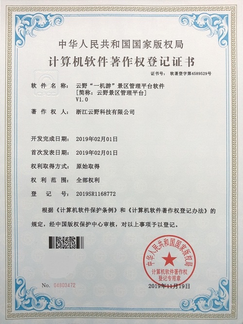 《云野“一機(jī)游”景區(qū)管理平臺(tái)軟件V1.0》于2019年11月19日被正式授予《中華人民共和國(guó)國(guó)家版權(quán)局計(jì)算機(jī)軟件著作權(quán)登記證書(shū)》,登記號(hào)為2019SR1168772。