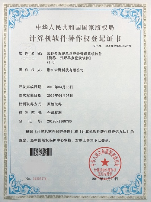 《云野多系統(tǒng)單點(diǎn)登錄管理系統(tǒng)軟件V1.0》于2019年11月19日被正式授予《中華人民共和國(guó)國(guó)家版權(quán)局計(jì)算機(jī)軟件著作權(quán)登記證書(shū)》,登記號(hào)為2019SR1168780。