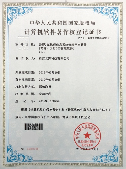 《云野GIS地理信息系統(tǒng)管理平臺(tái)軟件V1.0》于2019年11月19日被正式授予《中華人民共和國(guó)國(guó)家版權(quán)局計(jì)算機(jī)軟件著作權(quán)登記證書(shū)》,登記號(hào)為2019SR1168754。