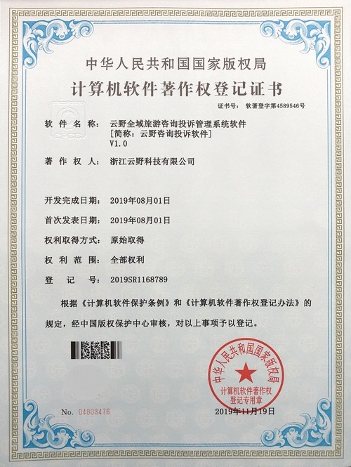 《云野全域旅游咨詢投訴管理系統(tǒng)軟件V1.0》于2019年11月19日被正式授予《中華人民共和國(guó)國(guó)家版權(quán)局計(jì)算機(jī)軟件著作權(quán)登記證書(shū)》,登記號(hào)為2019SR1168789。