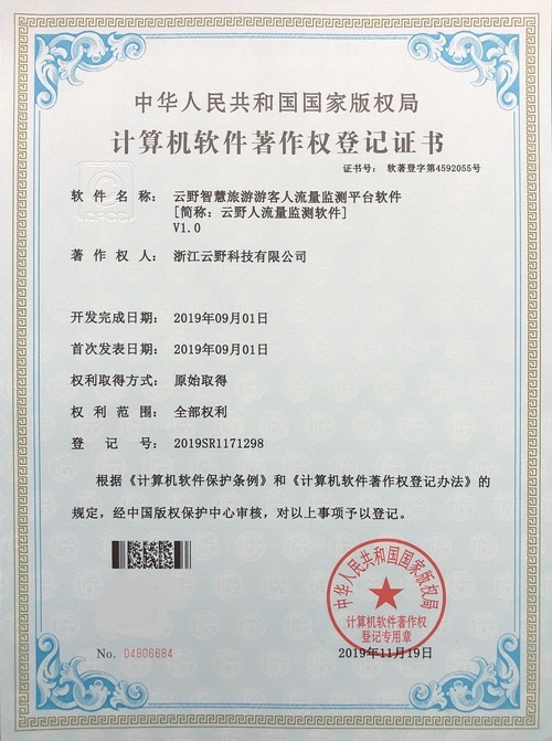 《云野智慧旅游游客人流量監(jiān)測(cè)平臺(tái)軟件V1.0》于2019年11月19日被正式授予《中華人民共和國(guó)國(guó)家版權(quán)局計(jì)算機(jī)軟件著作權(quán)登記證書(shū)》,登記號(hào)為2019SR1171298。