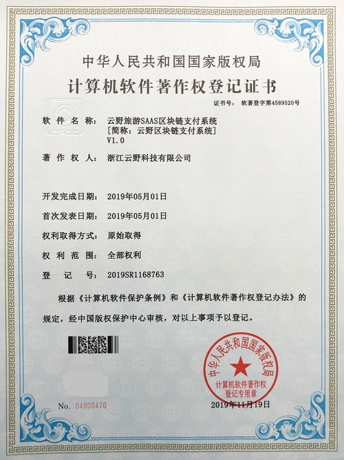 《云野旅游SAAS區(qū)塊鏈支付系統(tǒng)V1.0》于2019年11月19日被正式授予《中華人民共和國(guó)國(guó)家版權(quán)局計(jì)算機(jī)軟件著作權(quán)登記證書(shū)》,登記號(hào)為2019SR1168763。